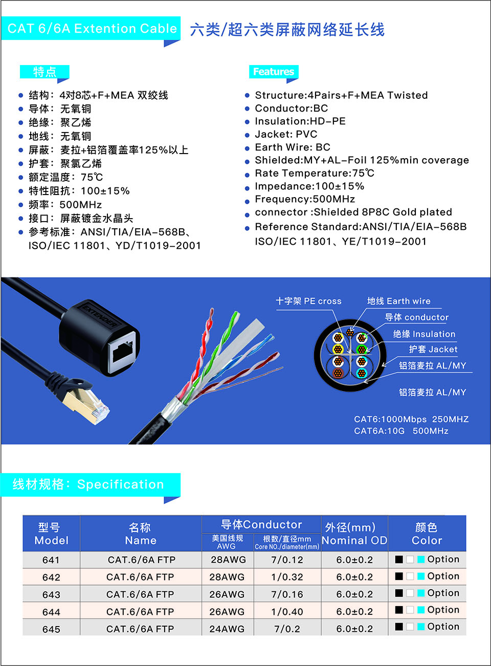 "Male-to-female extension cable" refers to Category 5e single-shielded twisted pair (FTP—shielded Twisted Pair) and Category 5e double-shielded twisted pair. Male to female extension cable, the male end is RJ45 crystal plug, the female end has ear extension cable and non ear extension cable, shielded twisted pair cable is composed of multiple pairs of twisted pair wires and a plastic sheath. Shielded twisted pair cables are divided into single shielded twisted pair and double shielded twisted pair. Single shielded network cable is composed of aluminum foil + 8 core wire + PVC jacket, and double shielded twisted pair is composed of aluminum foil + braided + 4 pairs of 8 cores + PVC jacket.